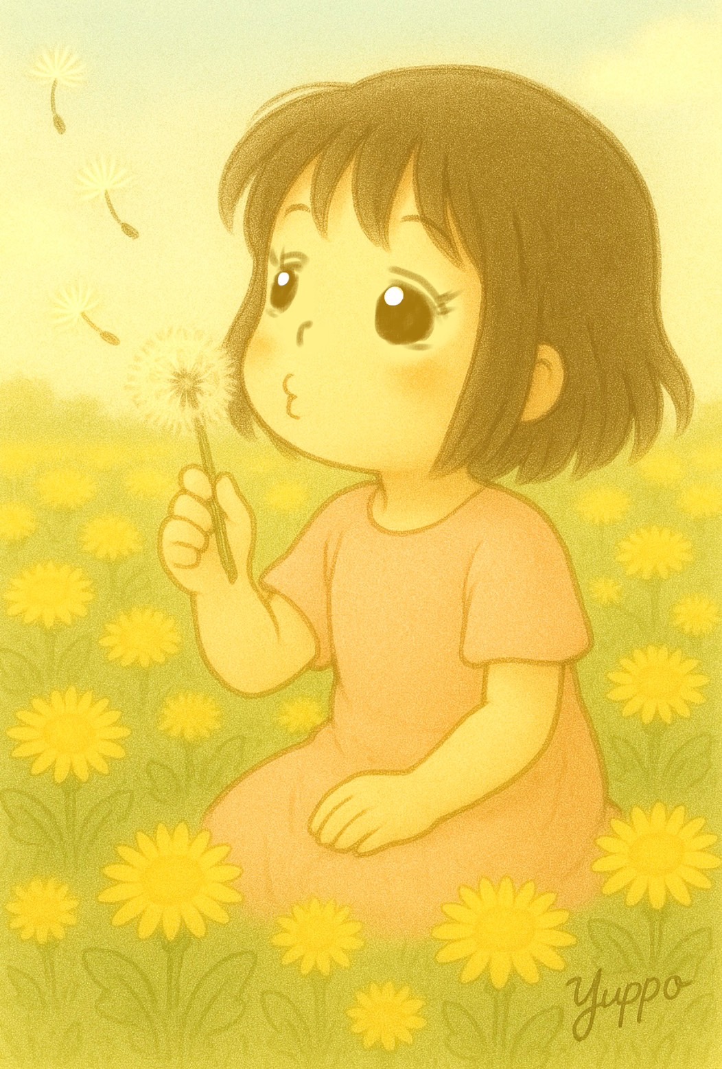 赤い前掛けをして、 風や花、動物たちと「ぽふぽふ」お話をするのが大好きです。